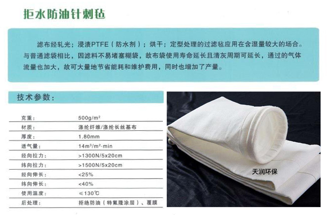 材质为涤纶针刺毡,防水防油处理,选用优等聚酯纤维,耐酸碱耐水解性均得到增强。高强低伸工业丝作基布,使强度提高。能围绕纤维表面形成分子屏障,可防止水及各种油污物沾附和渗透。同普通除尘布袋相比,不但具备拒水防油的特性,而且对粉尘来讲,还具有抗粘结性和易于剥离防 静电性能。