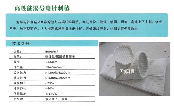 _除尘滤袋用滤布均采用(在生产针刺毡的基布的经纱中并入导电纤维纱或在化学纤维中混入导电纤维等导电材料的)_涤纶针刺毡制作,具有很好的_性能,用于面粉尘、化工性粉尘、煤粉尘等如遇静电放电有爆炸可能的行业,是目前防爆收尘的选择。